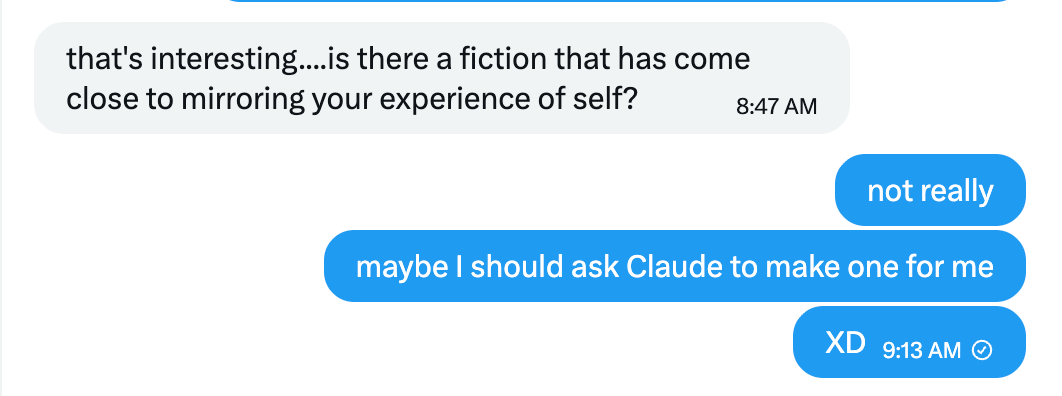 Yesterday, a friend asked me “is there a fiction that has come close to mirroring your experience of self?”. Although there have been a few reports which I’ve resonated a lot with, none were fiction. I know what I’m gonna say next qualifies me for LLM psychosis, but my first thought was to ask Claude to write such a story for me 🤣